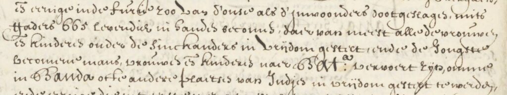 In similar fashion, we can find in this bundle information on the Lamey massacre hidden in the memorie (advice) of governor Putmans to his successor. Again, the title would not provide any clue, but a lexical search on ontbloot* (eradicated) and lamei* (Liuqiu island) is sufficient to uncover information on the genocidal atrocities. In his letter, the governor reported that a large share of the inhabitants who survived during the first attacks died out of the harshness, hunger and thirst that was inflicted upon them by the VOC soldiers.