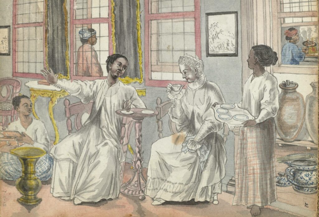 A woman cooking in a European house in Batavia, likely an enslaved person. Detail from the sketchbook of Jan Brandes, dl. 2 (1808), p. 23. Collection of Rijksmuseum, NG-1985-7-2-15. Public domain.